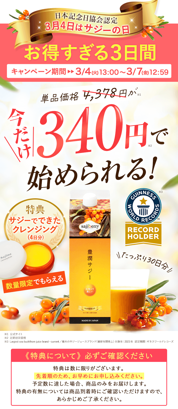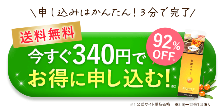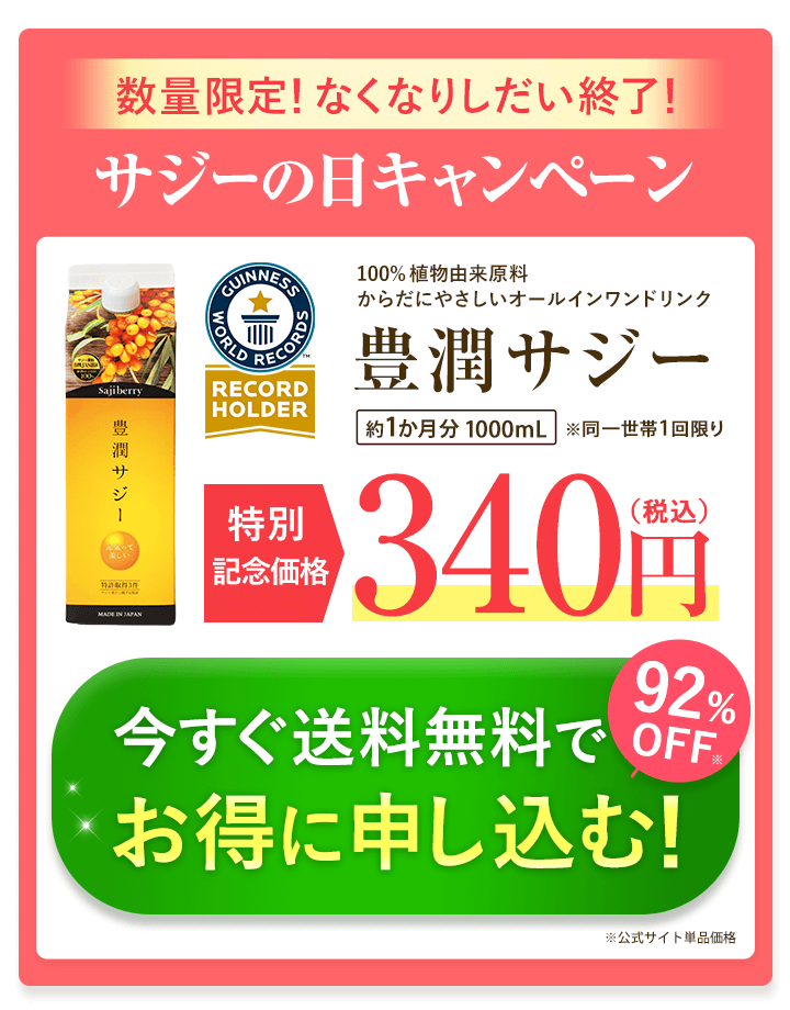 | 子供も飲んで大丈夫? | 豊潤サジーは食品ですので、年齢制限はございません。 必須アミノ酸、ビタミン、ミネラルなどお子さまの成長期に欠かせない成分が多く含まれており、ご家族皆さまでのご飲用をおすすめしております。しかし、酸味が強いため、乳製品やフルーツジュースなどで十分希釈し、様子を見ながら少量ずつお試しください。 |