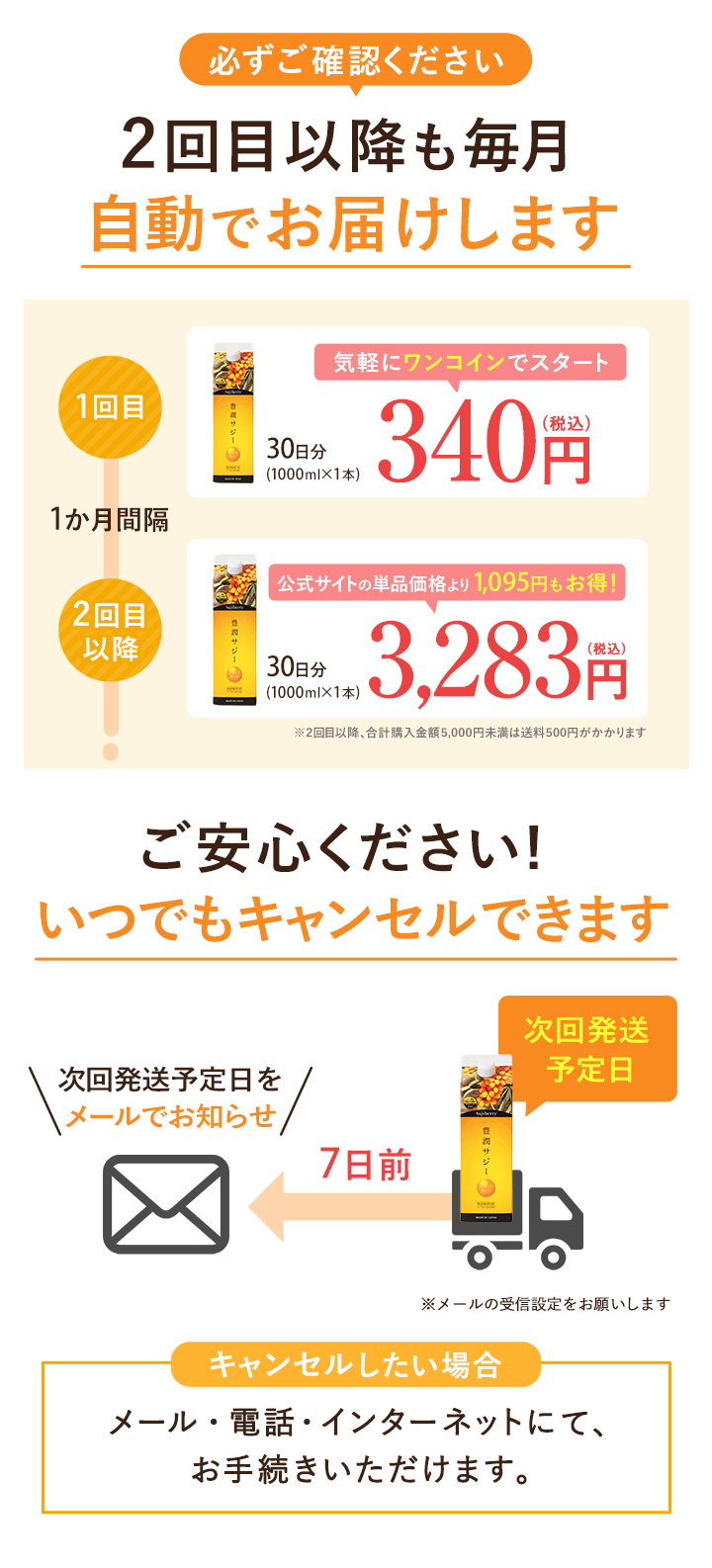 | 定期購入プランの内容 | 1か月ごとに自動で豊潤サジーを1本(1,000ml) お届けする定期購入プランです。 解約のご連絡があるまで、毎月自動更新です。 |
