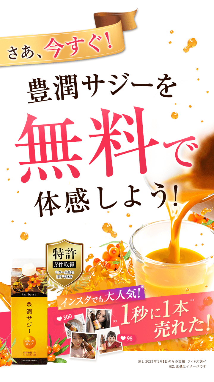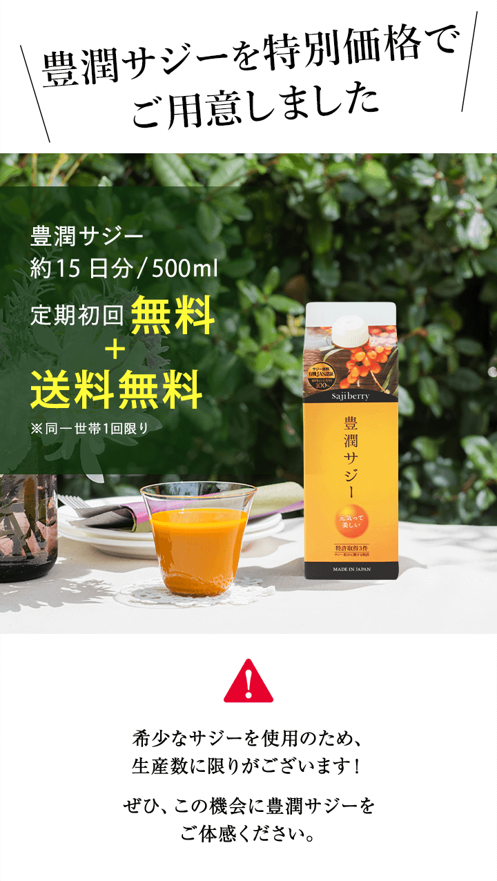 | 子供も飲んで大丈夫? | 豊潤サジーは食品ですので、年齢制限はございません。 必須アミノ酸、ビタミン、ミネラルなどお子さまの成長期に欠かせない成分が多く含まれており、ご家族皆さまでのご飲用をおすすめしております。しかし、酸味が強いため、乳製品やフルーツジュースなどで十分希釈し、様子を見ながら少量ずつお試しください。 |