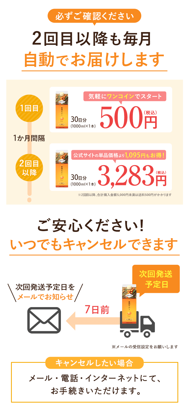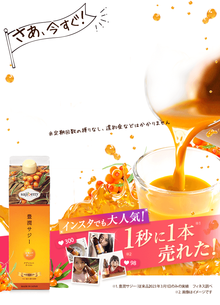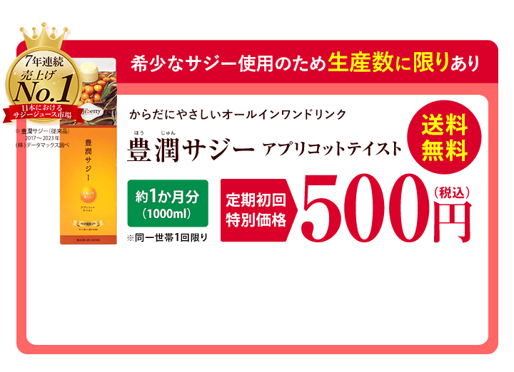 | 定期購入プランの内容 | 1か月ごとに自動で豊潤サジーアプリコットテイストを1本(1,000ml) お届けする定期購入プランです。 解約のご連絡があるまで、毎月自動更新です。 |