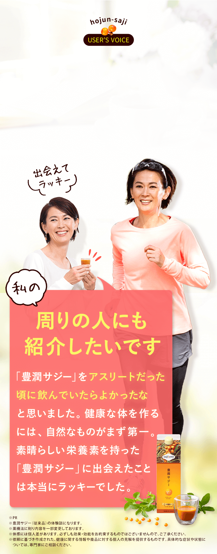 | どんな味ですか? | 豊潤サジーアプリコットテイストは、飲みやすさにこだわり、まろやかで甘酸っぱいフルーティな味わいです。アプリコットのやさしい甘みとみかんの爽やかさをお楽しみいただけます。 |