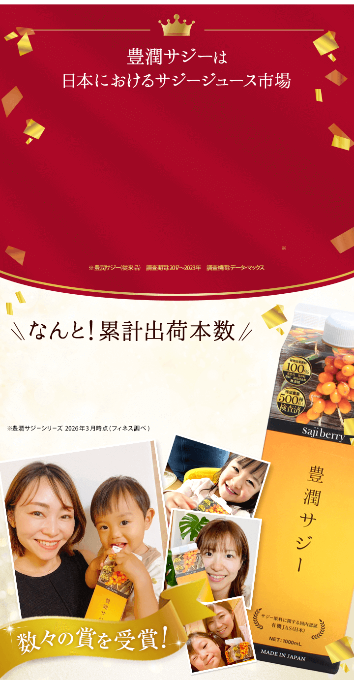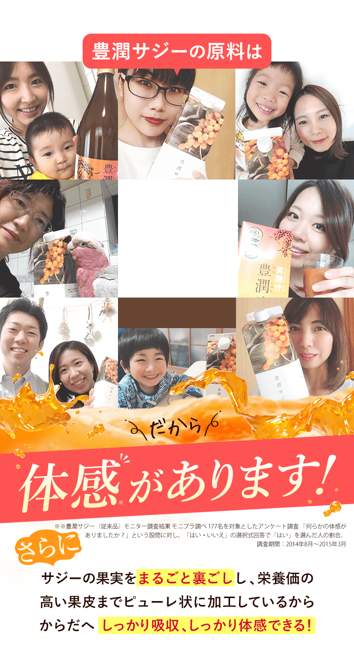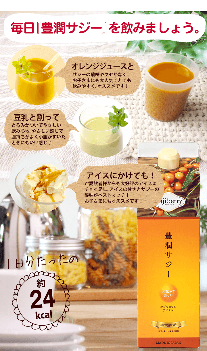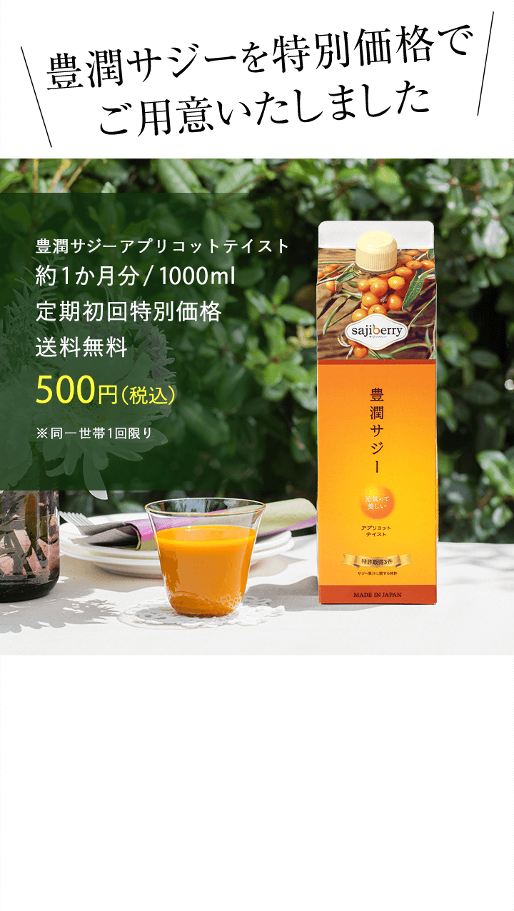 | 子供も飲んで大丈夫? | 豊潤サジーアプリコットテイストは食品ですので、年齢制限はございません。 必須アミノ酸、ビタミン、ミネラルなどお子さまの成長期に欠かせない成分が多く含まれており、ご家族皆さまでのご飲用をおすすめしております。しかし、酸味が強いため、乳製品やフルーツジュースなどで十分希釈し、様子を見ながら少量ずつお試しください。 |