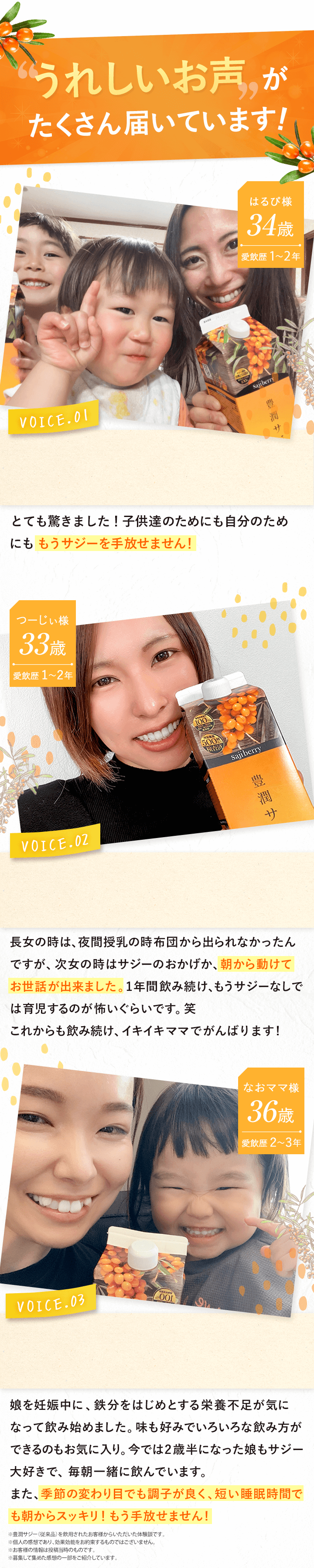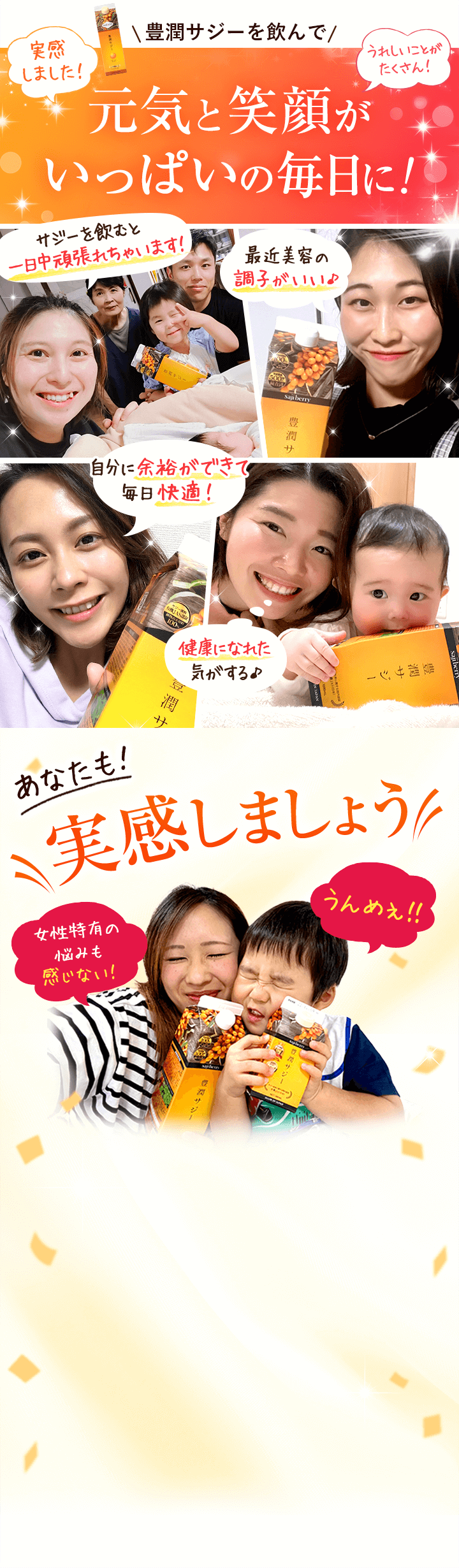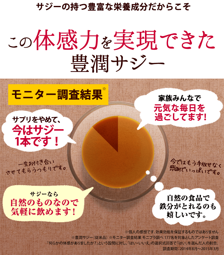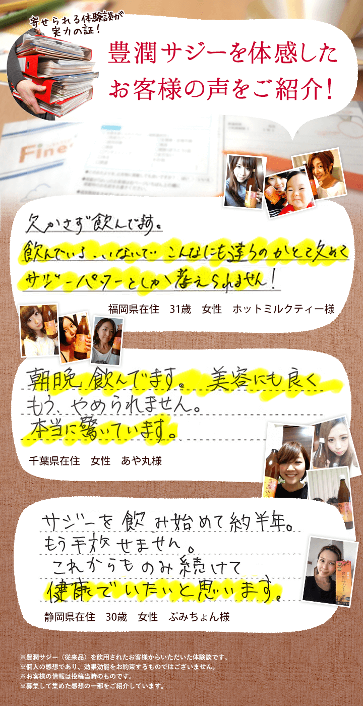 | 子供も飲んで大丈夫? | 豊潤サジーアプリコットテイストは食品ですので、年齢制限はございません。 必須アミノ酸、ビタミン、ミネラルなどお子さまの成長期に欠かせない成分が多く含まれており、ご家族皆さまでのご飲用をおすすめしております。しかし、酸味が強いため、乳製品やフルーツジュースなどで十分希釈し、様子を見ながら少量ずつお試しください。 |