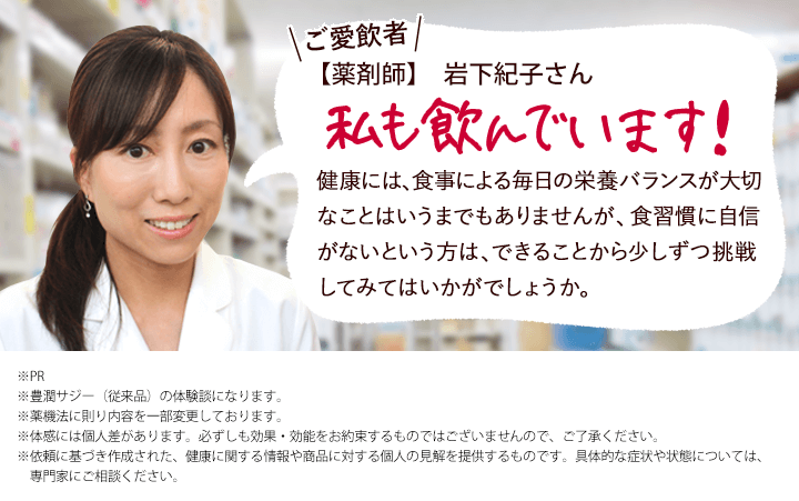 | カロリーはどれぐらい? | 1日の目安、30~60mLで約20~40kcalです。 200種類以上の栄養素を含み高栄養価ながらカロリーはとっても低く、1個180kcalのおにぎりと比べても断然低いので、忙しくて食事がしっかりとれない方、 ダイエット中で栄養不足の方へもおすすめです。 |
