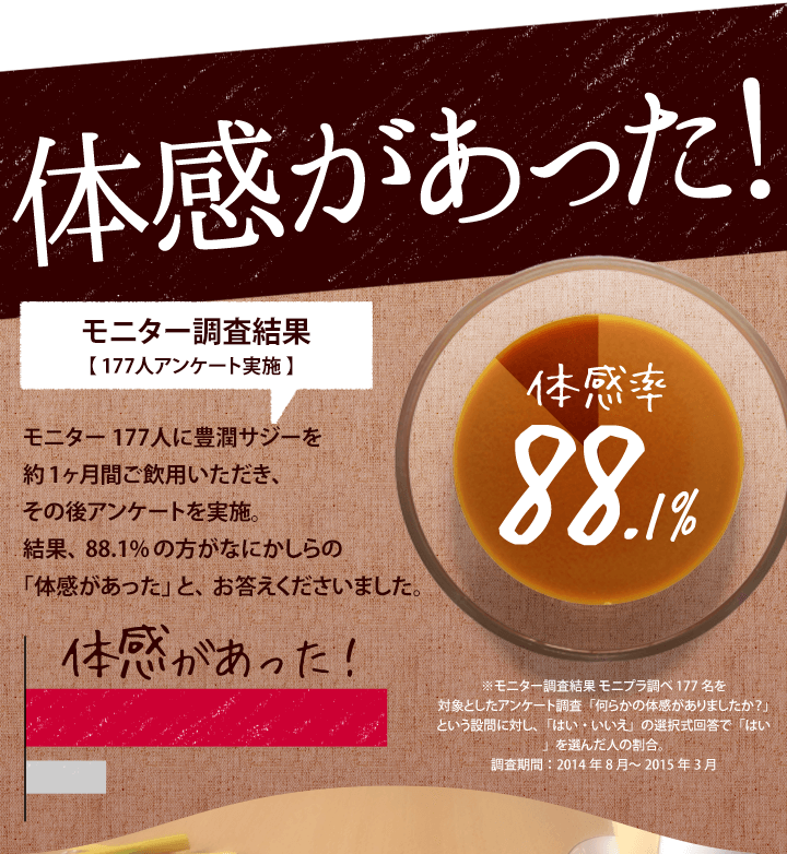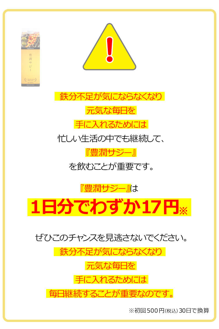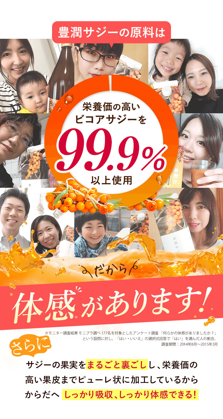 | 子供も飲んで大丈夫? | 豊潤サジーは食品ですので、年齢制限はございません。 必須アミノ酸、ビタミン、ミネラルなどお子さまの成長期に欠かせない成分が多く含まれており、ご家族皆さまでのご飲用をおすすめしております。しかし、酸味が強いため、乳製品やフルーツジュースなどで十分希釈し、様子を見ながら少量ずつお試しください。 |