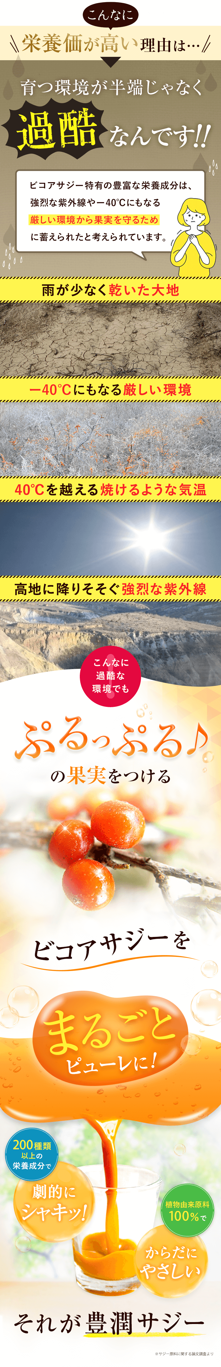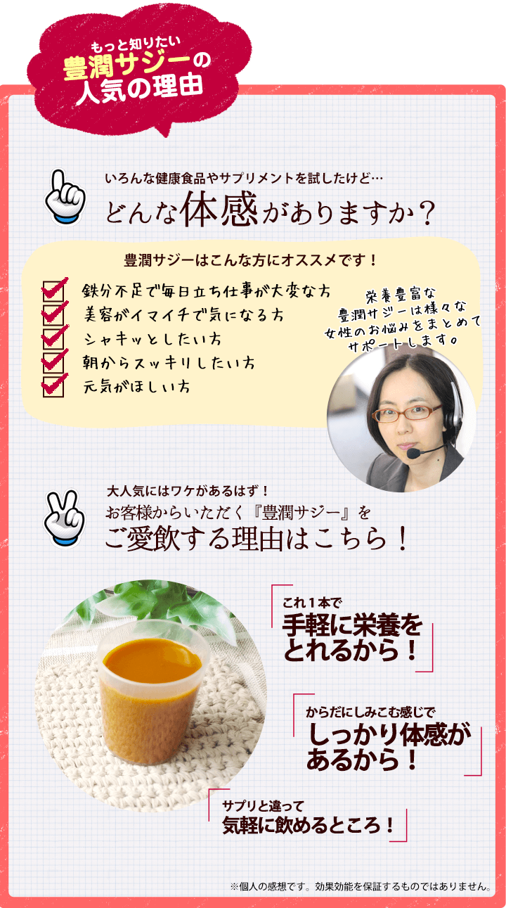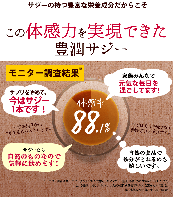 | カロリーはどれぐらい? | 1日の目安、30~60mLで約20~40kcalです。 200種類以上の栄養素※を含み高栄養価ながらカロリーはとっても低く、1個180kcalのおにぎりと比べても断然低いので、忙しくて食事がしっかりとれない方、 ダイエット中で栄養不足の方へもおすすめです。※サジー原料に関する論文調査より |