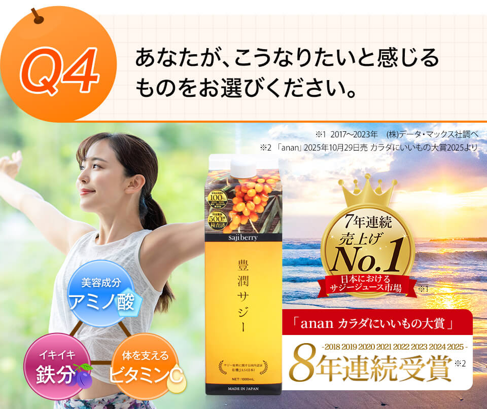 | どんな味ですか? | 豊潤サジーは、すっぱい成分のリンゴ酸(有機酸)をトップクラスに含有しています。そのため、酸味が強くなっております。植物由来の甘味料ステビアにより後味がほんのり甘い個性的な味です。 ※すべての食品中No.1のリンゴ酸含有量:食品成分データベース(文部科学省)で、2009~2022年の分析結果の平均値と比較。 ※成分分析依頼先:一般財団法人 日本食品分析センター ※栄養素の含有量は収穫年の天候等により変動がございます。 |