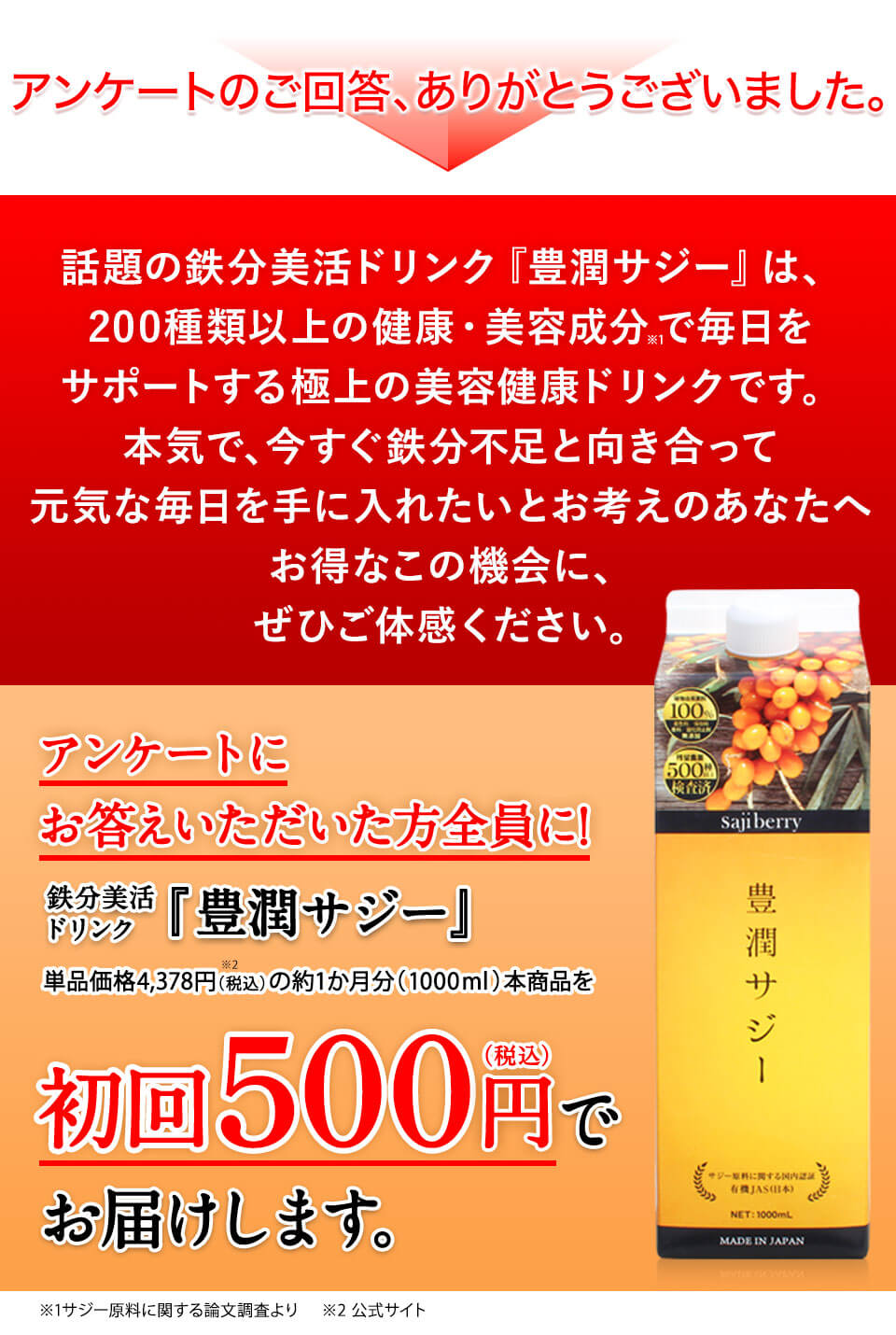 | 定期購入プランの内容 | 1か月ごとに自動で豊潤サジーを1本(1,000ml) お届けする定期購入プランです。 解約のご連絡があるまで、毎月自動更新です。 |