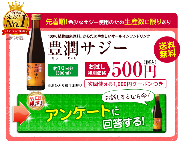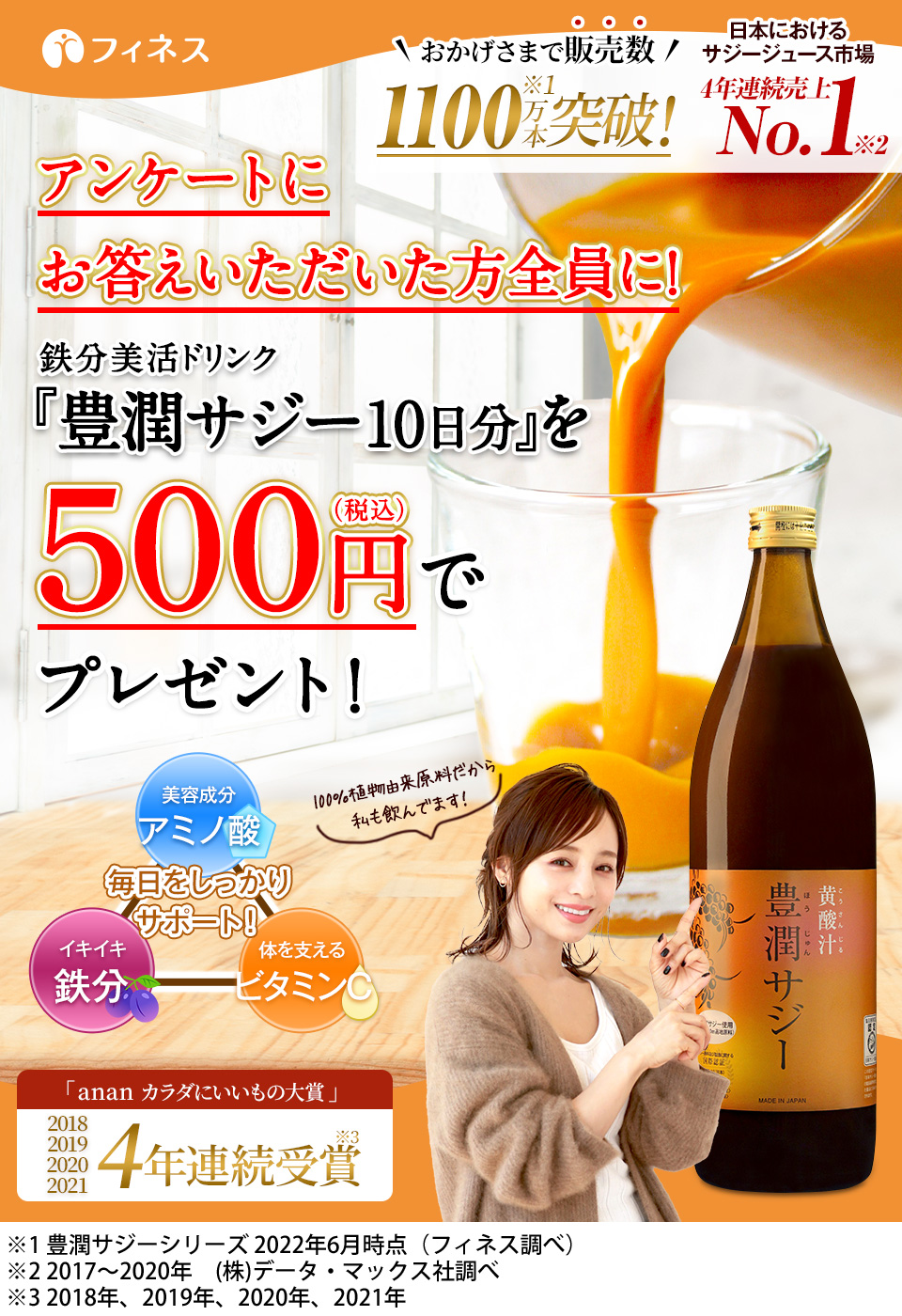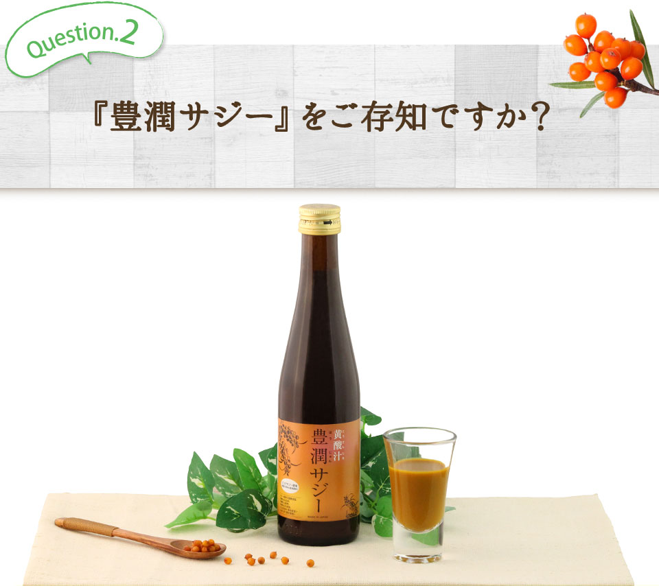 | 子供も飲んで大丈夫? | はい、大丈夫です。 豊潤サジーは果汁(食品)ですので、 お子様からご年配の方にもご飲用いただけます。お子様にはかかせない成分の必須アミノ酸をはじめ、ビタミン、ミネラルなどがたくさん含まれており、お子様へのご飲用もお勧めしております。 |
