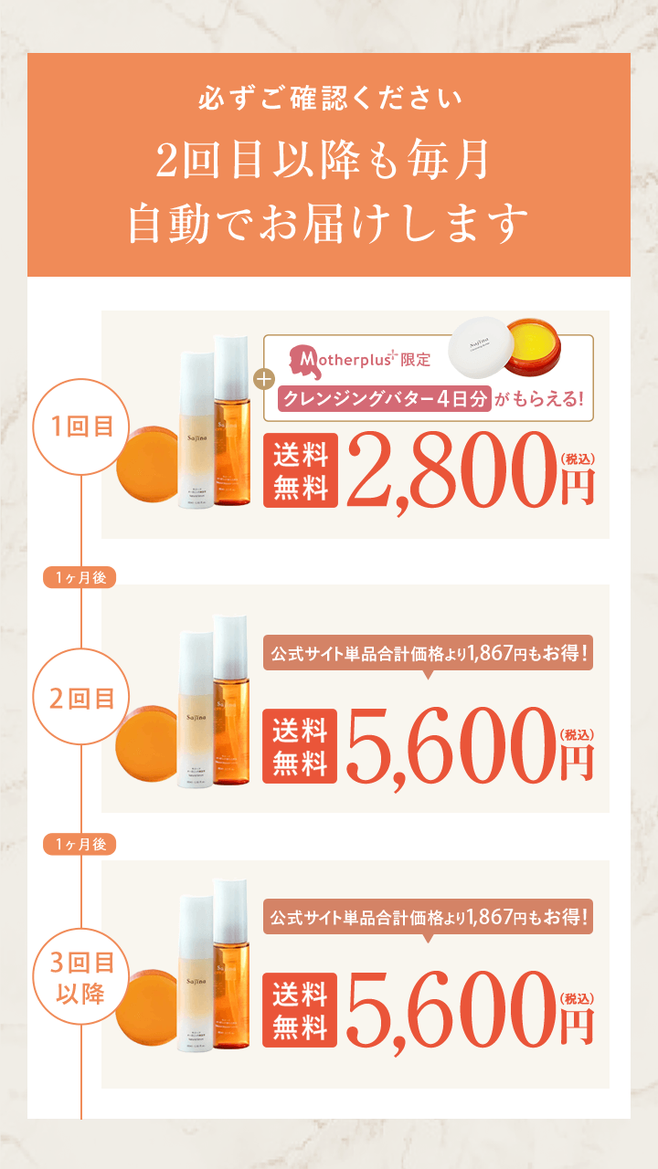 定期購入プランの内容 サジーナスキンヘルスケア3点セット​(石けん・導入化粧液・美容液)を​1か​月ごとに​1セットお届けする​定期購入プランです。